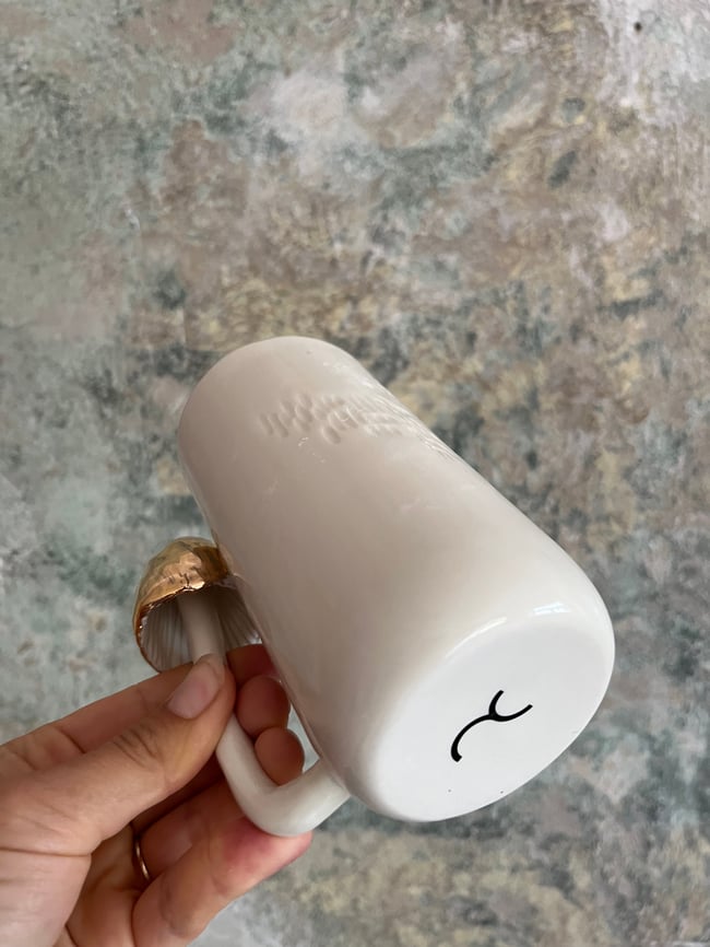 Unikāla, rokām darināta porcelāna krūze ar sēnes rokturi un keramikas zelta akcentu - zelta gliemezis krūzes iekšpusē.
